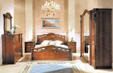 Имеет роскошные элементы из пенополиуретана, применены не только в отделке кровати, но и на комоде-секретере, тумбах, гардеробе. Великолепно они смотрятся в обрамлении зеркала.